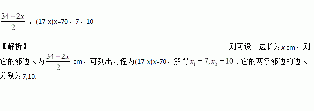 ,(17-x)x=70,7,10 【解析】则可设一边长为x cm,则它的邻边长为cm,可列出方程为(17-x)x=70,解得,它的两条邻边的边长分别为7,10.