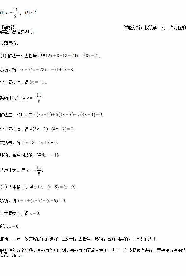 (1)解方程:4(3x+2)-6(3-4x)=7(4x-3).