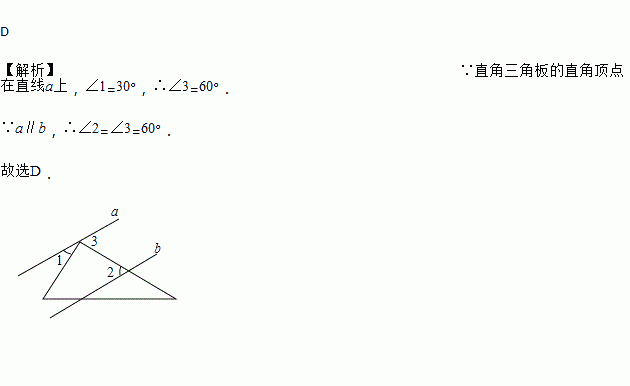 如图,已知a∥b,直角三角板的直角顶点在直线a上,若∠1=30°,则∠2等于( )