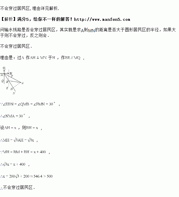 ,请通过计算说明如果不改变方向,输水路线是否会穿过居民区(参考数据: