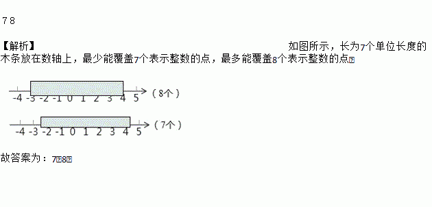 7 8 【解析】如图所示,长为7个单位长度的木条放在数轴上,最少能覆盖7个表示整数的点,最多能覆盖8个表示整数的点, 故答案为:7,8.