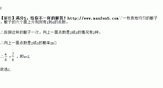 一枚质地均匀的骰子,骰子的六个面上分别刻有1到6的点数,投掷这样的骰子一次,向上一面点数是2或3的概率是,则a的值是( )