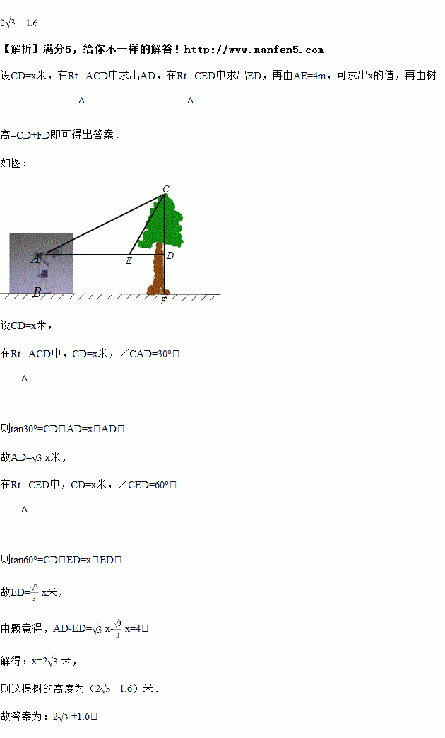 小敏想测一棵大树的高度,她站在地面某处测得树梢仰角为,再往大树方向前进米,测得树梢仰角为,已知小敏眼睛到地面距离为米,则大树高为________米.