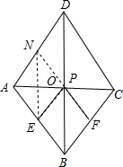 设AC交BD于O,作E关于AC的对称点N,连接NF,交AC于P,则此时EP+FP的值最小,![]()