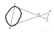 在综合实践课上,小明同学设计了如图测河塘宽AB的方案:在河塘外选一点O,连结AO,BO,测得m,m,延长AO,BO分别到D,C两点,使m,m,又测得m,则河塘宽AB=________m.