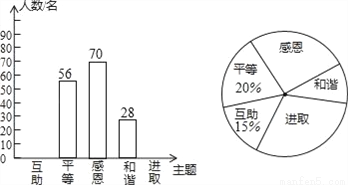 某校开展了“互助、平等、感恩、和谐、进取”主题班会活动,活动后,就活动的个主题进行了抽样调查(每位同学只选最关注的一个),根据调查结果绘制了两幅不完整的统计图.根据图中提供的信息,解答下列问题: