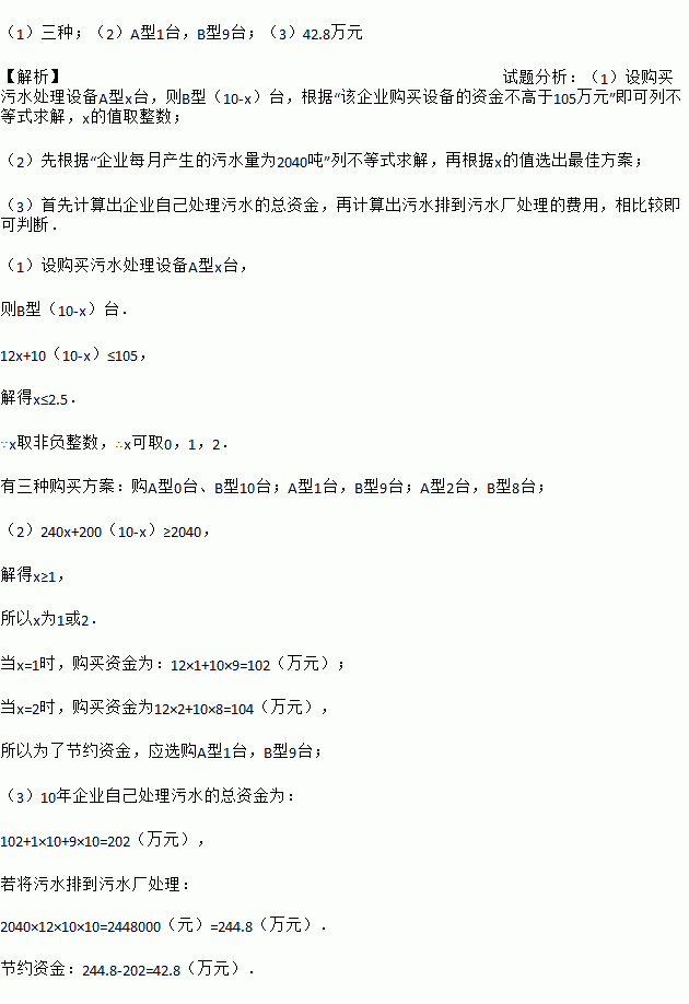 为了保护环境,某企业决定购买10台污水处理设备.现有A、B两种型号的设备,其中每台的价格、月处理污水量及年消耗费如右表:经预算,该企业购买设备的资金不高于105万元.