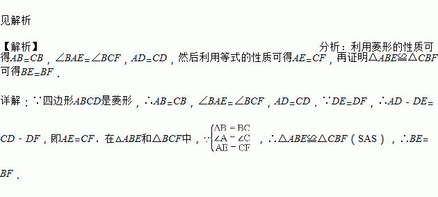 已知:如图,四边形ABCD是菱形.以点D为圆心画弧,该弧分别与边AD、CD相交于点E、F,连接BE、BF.求证:BE=BF.