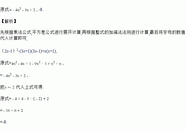 先化简,再求值:(2x-1)2-(3x+1)(3x-1)+x(x+1),其中x=-2..