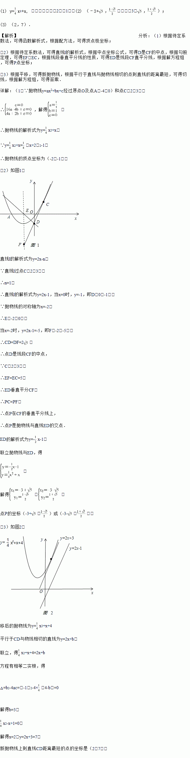 (3)如图2,将(1)中所求抛物线向上平移4个单位得到新抛物线,求新抛物线上到直线CD距离最短的点的坐标.(直接写出结果,不要解答过程)