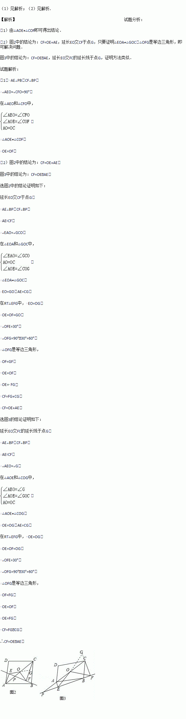 (2)直线BP绕点B逆时针方向旋转,当∠OFE=30°时,如图2、图3的位置,猜想线段CF、AE、OE之间有怎样的数量关系?请写出你对图2、图3的猜想,并选择一种情况给予证明.