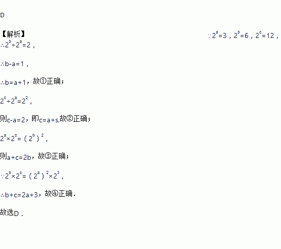 已知2a=3,2b=6,2c=12,则 a. b. c的关系为①b=a+1②c=a+2③a+c=2b ④b+c=2a+3,其中正确的个数有 ( )