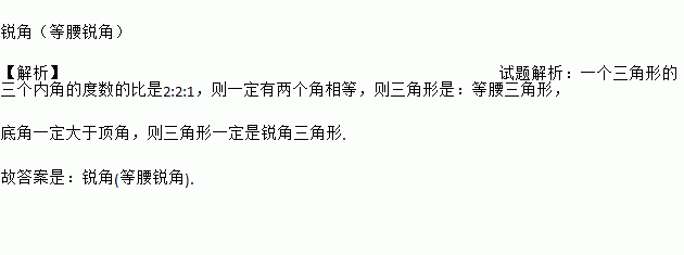 一个三角形的三个内角的度数的比是2:2:1,这个三角形是_________三角形.