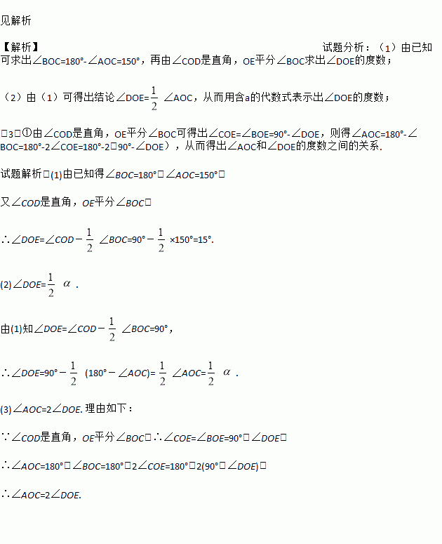 (3)将图①中的∠DOC绕顶点O顺时针旋转至图②的位置,探究∠AOC和∠DOE的度数之间的关系,写出你的结论,并说明理由;