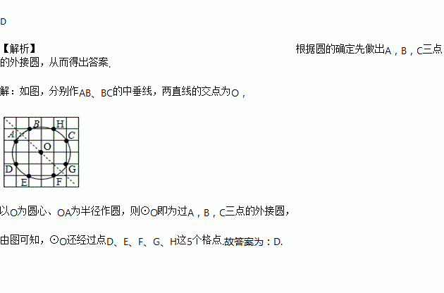 如图,点 A,B,C均在6×6的正方形网格格点上,过A,B,C三点的圆除经过A,B,C三点外还能经过的格点最多有( )个