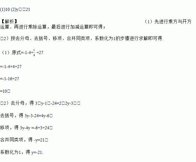 (1)计算:-14-÷(-)2+|-3|3; (2)解方程:-2=