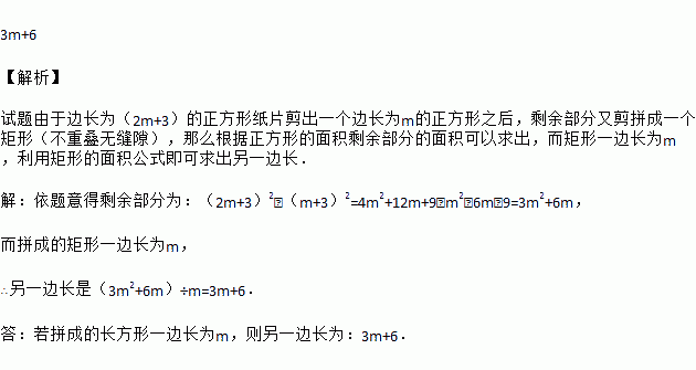 如图,边长为2m+3的正方形纸片剪出一个边长为m+3的正方形之后,剩余部分可剪拼成一个长方形,若拼成的长方形一边长为m,则另一边长为