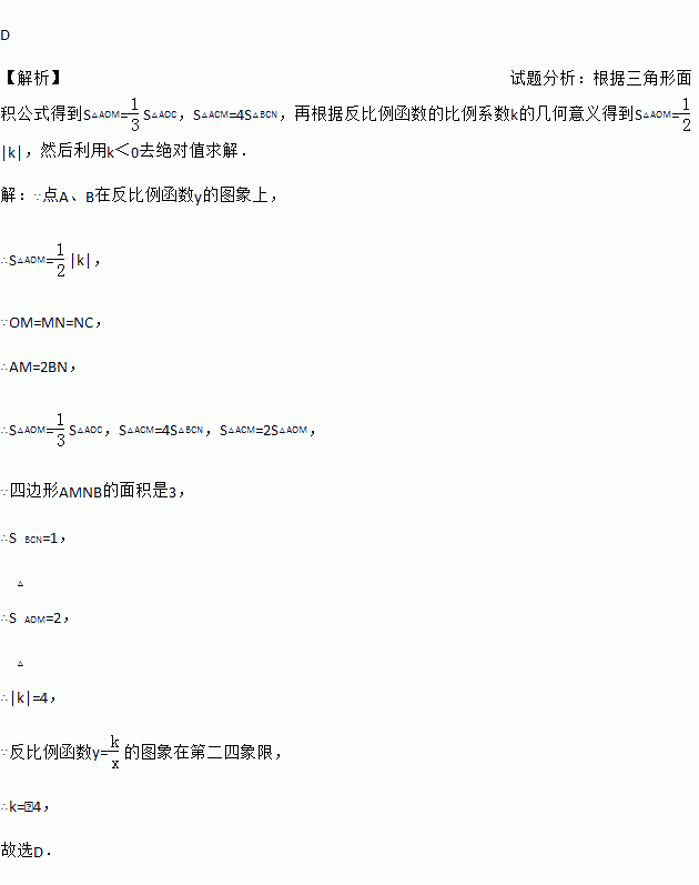 D 【解析】试题分析:根据三角形面积公式得到S△AOM=S△AOC,S△ACM=4S△BCN,再根据反比例函数的比例系数k的几何意义得到S△AOM=|k|,然后利用k<0去绝对值求解. 【解析】 ∵点A、B在反比例函数y的图象上, ∴S△AOM=|k|, ∵OM=MN=NC, ∴AM=2BN, ∴S△AOM=S△AOC,S△ACM=4S△BCN,S△ACM=2...