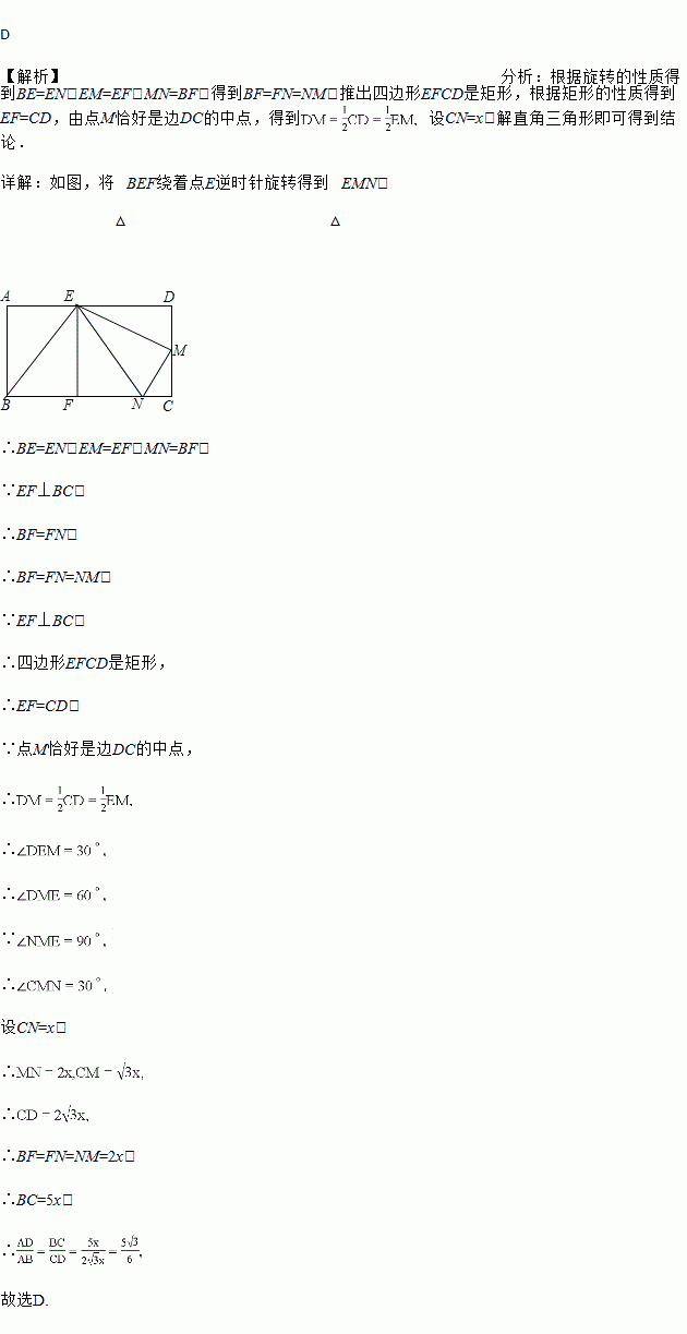 如图,在矩形ABCD中,点E是边AD上一点,过点E作EF⊥BC,垂足为点F,将△BEF绕着点E逆时针旋转,使点B落在边BC上的点N处,点F落在边DC上的点M处,若点M恰好是边CD的中点,那么
