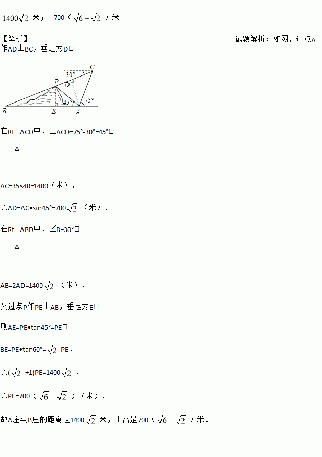 如图,在小山的东侧A庄,有一热气球,由于受西风的影响,以每分钟35米的速度沿着与水平方向成75度角的方向飞行,40分钟时到达C处,此时气球上的人发现气球与山顶P点及小山西侧的B庄在一条直线上,同时测得B庄的俯角为30度,又在A庄测得山顶P的仰角为45度,求A庄与B庄的距离___________,山高__________.