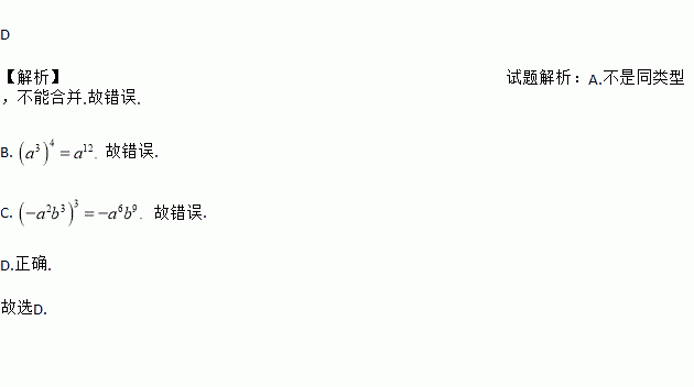 A. a3+a4=a7 B. (a3)4=a7 C. (﹣a2b3)3=a6b9 D. 2a4•3a5=6a9