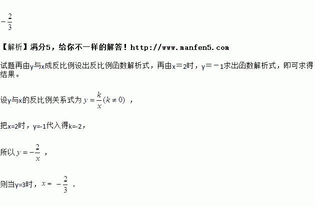 已知y与x成反比例,并且当x=2时,y=-1,则当y=3时,x的值是________.