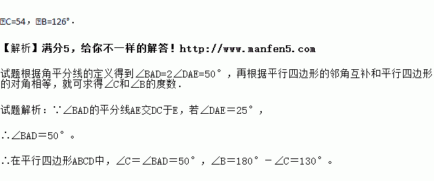 如图,在□ABCD中,∠BAD的平分线AE交DC于E,若∠DAE=25°,求∠C、∠B的度数。