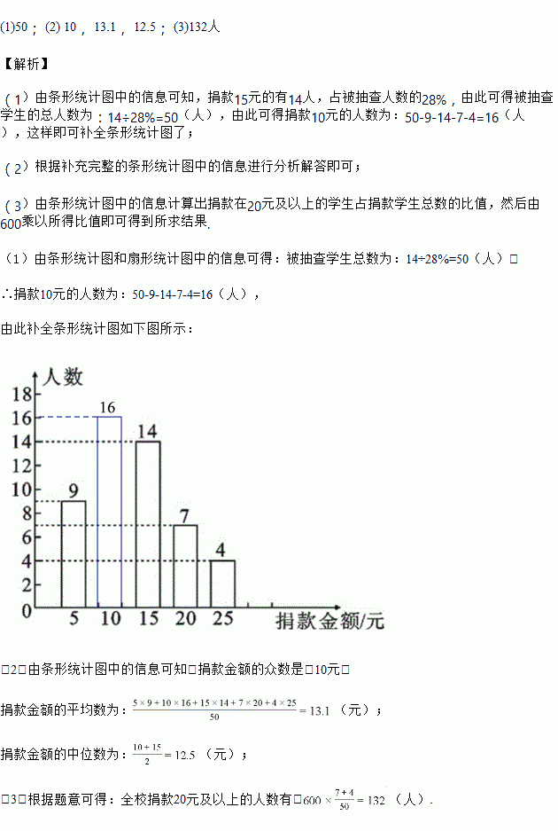 (3)在八年级600名学生中,捐款20元及以上(含20元)的学生估计有多少人?