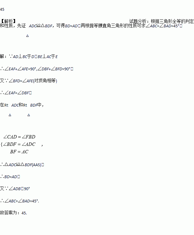 如图,△ABC中,AD⊥BC于D,BE⊥AC于E,AD与BE相交于点F,若BF=AC,则∠ABC=_________°.
