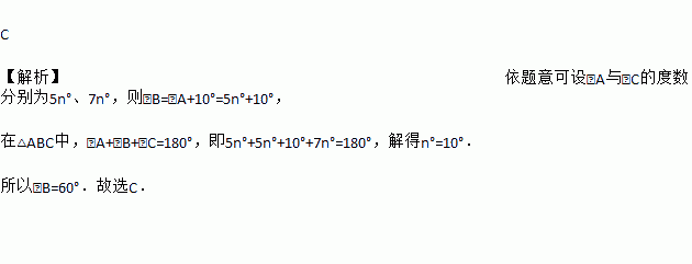 C 【解析】依题意可设∠A与∠C的度数分别为5n°、7n°,则∠B=∠A+10°=5n°+10°, 在△ABC中,∠A+∠B+∠C=180°,即5n°+5n°+10°+7n°=180°,解得n°=10°. 所以∠B=60°.故选C.