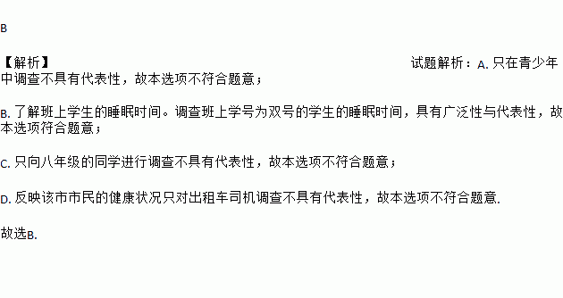 B. 为了解班上学生的睡眠时间,调查班上学号为双号的学生的睡眠时间