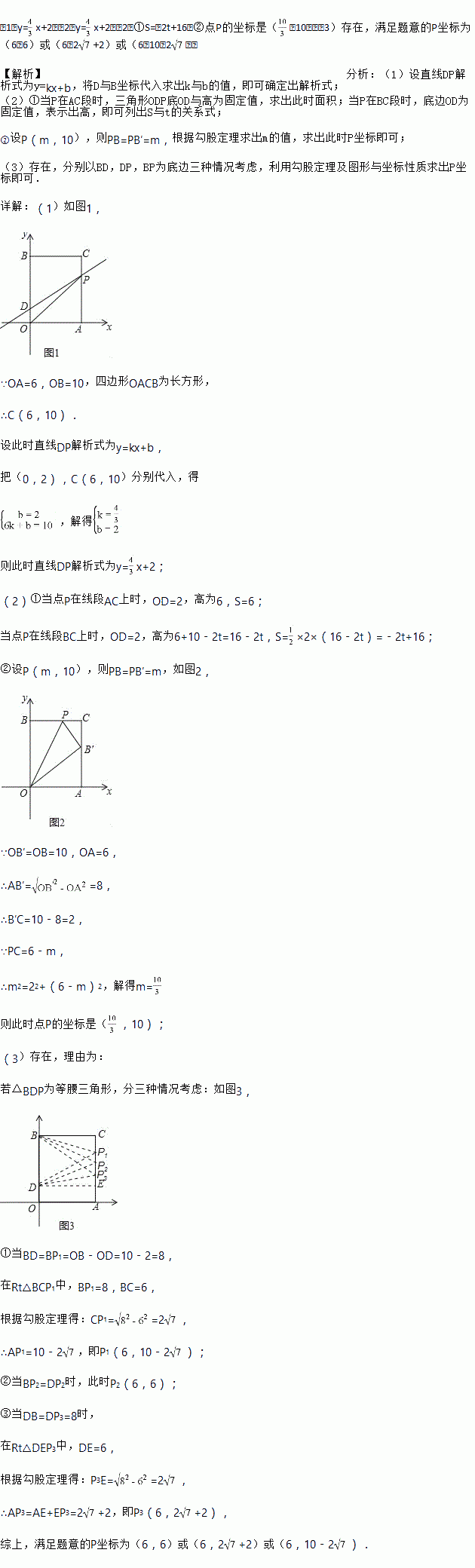 如图1,在平面直角坐标系中,O是坐标原点,长方形OACB的顶点A、B分别在x轴与y轴上,已知OA=6,OB=10.点D为y轴上一点,其坐标为(0,2),点P从点A出发以每秒2个单位的速度沿线段AC﹣CB的方向运动,当点P与点B重合时停止运动,运动时间为t秒.