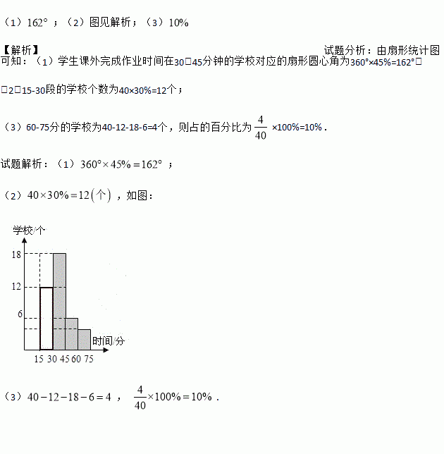 (1);(2)图见解析;(3) 【解析】试题分析:由扇形统计图可知:(1)学生课外完成作业时间在30~45分钟的学校对应的扇形圆心角为360°×45%=162°; (2)15-30段的学校个数为40×30%=12个; (3)60-75分的学校为40-12-18-6=4个,则占的百分比为×100%=10%. 试题解析:(1); (2),如图: (3), . ...