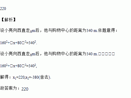 已知小明与小亮两人在同一地点,若小明向北直走160 m,再向东直走80 m,可到购物中心,则小亮向西直走____m后,他与购物中心的距离为340 m.