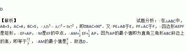 如图,在△ABC中,AB=3,AC=4,BC=5,P为边BC上一动点,PE⊥AB于E,PF⊥AC于F,M为EF中点,则AM的最小值为( )