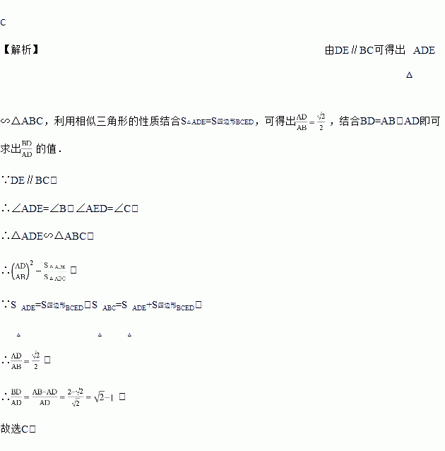 如图,平行于BC的直线DE把△ABC分成面积相等的两部分,则的值为( )