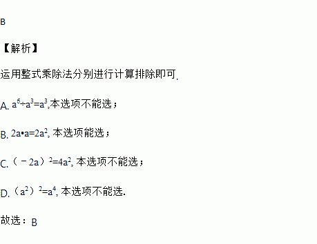 A. a6÷a3 B. 2a•a C. (﹣2a)2 D. (a2)2