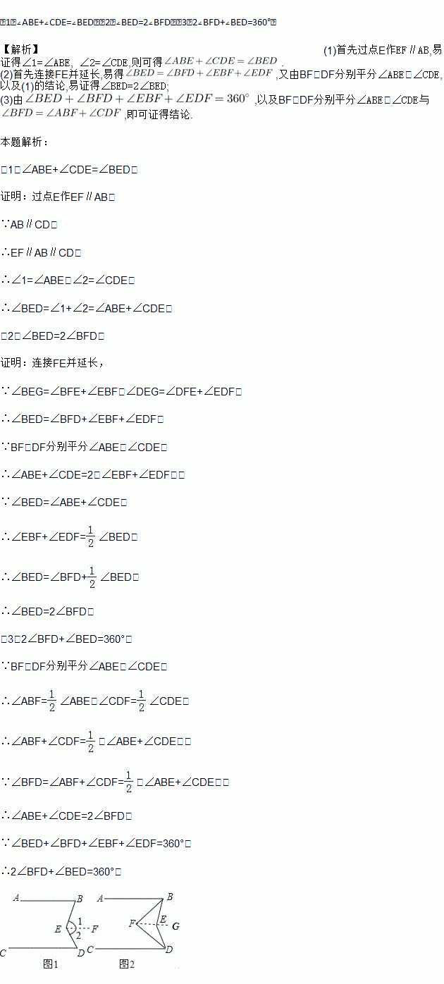 (2)如图2,点E在直线BD的左侧,BF、DF分别平分∠ABE、∠CDE,猜想∠BFD和∠BED的数量关系,并证明你的结论;
