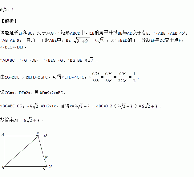 在矩形ABCD中,∠B的平分线BE与AD交于点E,∠BED的平分线EF与DC交于点F,若AB=9,DF=2FC,则BC=___________.(结果保留根号)