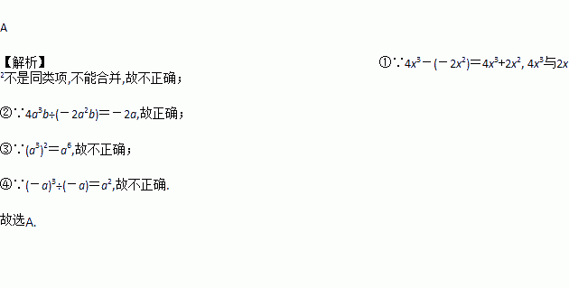 下列是某同学在一次作业中的计算摘录:①4x3-(-2x2)=-6x5;②4a3b÷(-2a2b)=-2a;③(a3)2=a5;④(-a)3÷(-a)=-a2.其中正确的个数有( )