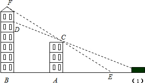 小明开着汽车在平坦的公路上行驶,前方出现两座建筑物A、B(如图),在(1)处小颖能看到B建筑物的一部分,(如图),此时,小明的视角为30°,已知A建筑物高25米.