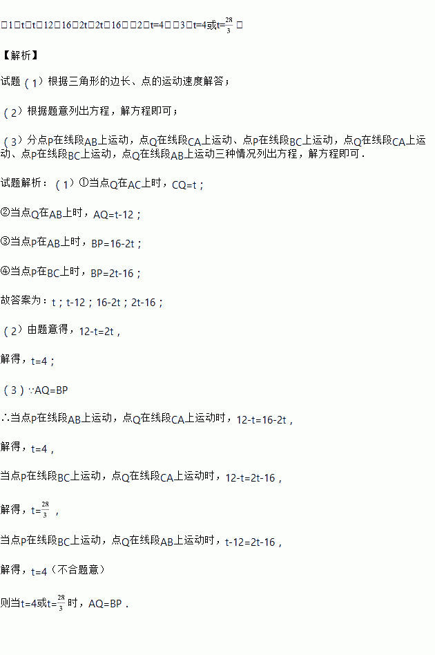 在直角三角形ABC中,若AB=16cm,AC=12cm,BC=20cm. 点P从点A开始以2厘米/秒的速度沿A→B→C的方向移动,点Q从点C开始以1厘米/秒的速度沿C→A→B的方向移动,如果点P、Q同时出发,用t(秒)表示移动时间,那么: