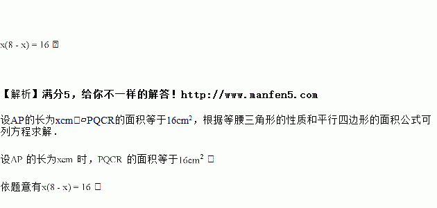 如图,等腰直角三角形中,,,动点从出发沿向移动,通过点引,,问当等于多少时,平行四边形的面积等于?设的长为,列出关于的方程.