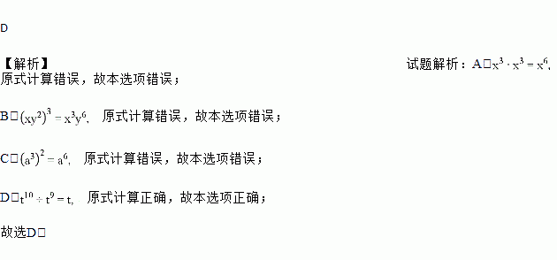 A. x3•x3=2x6 B. (xy2)3=xy6 C. (a3)2=a5 D. t10÷t9=t