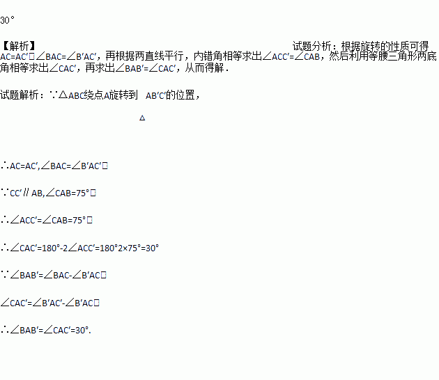 如图,在△ABC中,∠CAB=75°,在同一平面内,将△ABC绕点A旋转到△AB’C’的位置,使CC’//AB,求∠BAB’的度数。