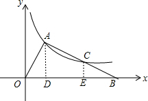 9.分析 作AD⊥x轴于D,CE⊥x轴于E,如图,设A(t,$\frac{k}{t}$),先证明CE为△ADB的中位线得到CE=$\frac{1}{2}$AD=$\frac{k}{2t}$,DE=BE,则利用反比例函数图象上点的坐标特征可表示出C(2t,$\frac{k}{2t}$),于是得到DE=BE=t,然后证明△OAD∽△OBA,利用相似比计算出t,再利用勾股定理计算出k.
