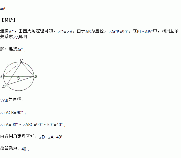 如图,已知AB是⊙O的直径,点C,D在⊙O上,∠ABC=50°,则∠D=_____°.