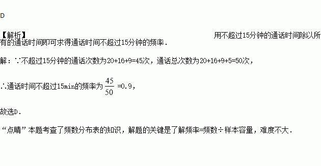 则通话时间不超过 15min 的频率为 ( )