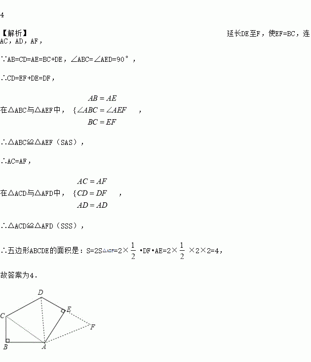 如图,五边形ABCDE中,∠ABC=∠AED=90°,AB=CD=AE=BC+DE=2,则这个五边形ABCDE的面积是_____.