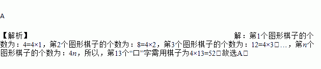 A 【解析】【解析】 第1个图形棋子的个数为:4=4×1,第2个图形棋子的个数为:8=4×2,第3个图形棋子的个数为:12=4×3,…,第n个图形棋子的个数为:4n,所以,第13个“口”字需用棋子为4×13=52.故选A.